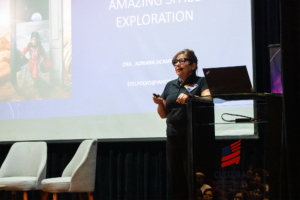 Por su parte, Adriana Ocampo trasladó a los estudiantes a uno de los hitos más trascendentes de la geología planetaria: el descubrimiento del cráter Chicxulub en México, pieza clave para comprender la extinción de los dinosaurios. Destacó que este tipo de hallazgos no solo iluminan el pasado, sino que también nos preparan para el futuro al comprender mejor nuestro planeta. Además, resaltó el creciente rol de América Latina en la ciencia espacial y motivó a los jóvenes a perseverar en la búsqueda de sus sueños, recordándoles que la pasión y la resiliencia son las mayores herramientas para alcanzar grandes metas.