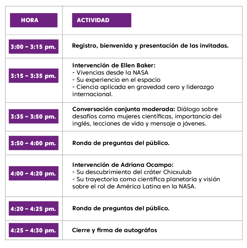 Un evento único con la participación de dos destacadas científicas de la NASA: Adriana Ocampo, geóloga planetaria de la NASA, reconocida mundialmente por su contribución al descubrimiento del cráter Chicxulub, evidencia del impacto que extinguió a los dinosaurios; y Ellen S. Baker, astronauta, médica y líder de cooperación internacional en la NASA.